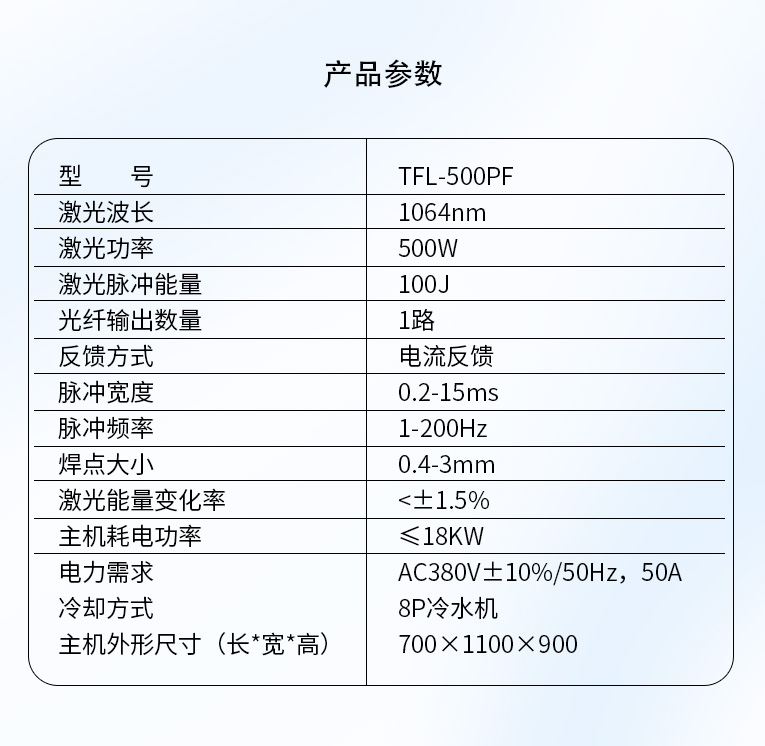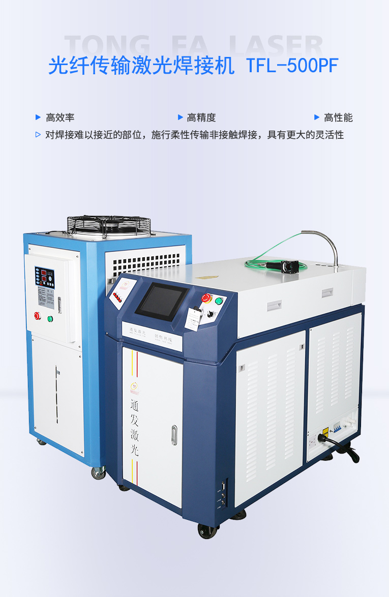 通發(fā)激光TFL-500PF光纖激光焊接機(jī),激光功率大,經(jīng)過(guò)光纖優(yōu)化獲得卓越的光束質(zhì)量,滿足1.5mm以內(nèi)料厚,熔深1mm以內(nèi)的廚衛(wèi),家電,高速不銹鋼激光焊接加工。