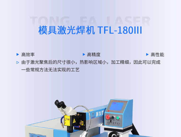 普通型模具激光焊機TFL-180Ⅲ是通發(fā)激光公司的模具激光焊機中銷量較大的傳統(tǒng)型,配置激光頭手搖升降與工作臺按鈕電動升降實現(xiàn)焊接不同厚度模具的激光焊加工。本系列機型適用于各類精密注塑模具激光補焊、壓鑄模具激光修補焊接;同時也適合鑄件沙孔激光修補、模具磨損激光修復(fù)、過切加工等的激光修補;各類金屬結(jié)構(gòu)件激光焊接加工、不銹鋼首飾激光焊接加工。