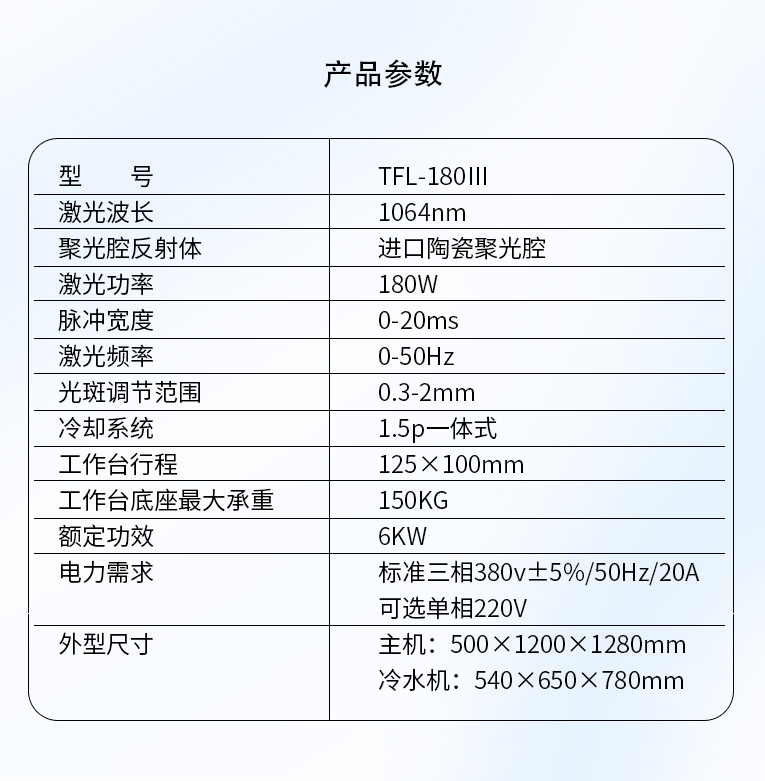 環(huán)境溫度:攝氏4度-攝氏32度。設(shè)備運行時,環(huán)境溫度不可以超過攝氏32度,因為激光電源部分,功率很高,一些功率器件運行時發(fā)出熱量需要及時散發(fā)出去,而環(huán)境溫度太高會導(dǎo)至不能正常散熱,會引起整個系統(tǒng)的工作不穩(wěn)定,甚至損壞。而冬天的時候,需要嚴防冷卻水結(jié)冰,因為激光晶體、氙燈、聚光腔都充滿了水,結(jié)冰會直接導(dǎo)致這些器件的損壞。冬天時如長時間不運行情況下,將腔內(nèi)的水排空;如再開機前,先重新加水,打開電源空氣開關(guān),先行主機不開,只開水機空機運行10分鐘,等水溫回復(fù)到攝氏4 度以上,再開主機。(強烈要求不能將設(shè)備放于室外或者低溫結(jié)冰的情況下使用,否則極易損壞設(shè)備)