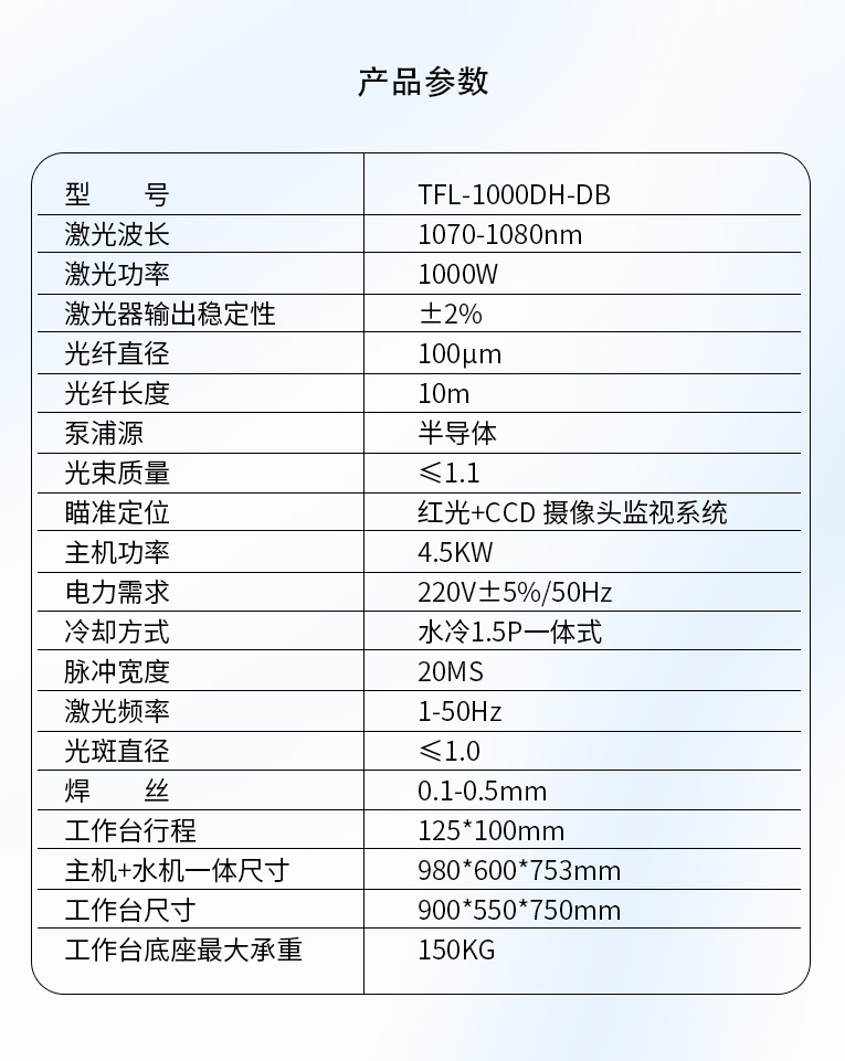 采用光纖激光器,反射率高,能量強(qiáng),免維護(hù),免調(diào)光,功耗少,相比傳統(tǒng) 模具焊來說,體積小,安全,穩(wěn)定性好超長使用壽命。 1000W光纖激光器,滿足銅、鋁焊接量大的模具及產(chǎn)品焊接加工需要。 高承重底座及工作臺(tái),保持輕便靈活的優(yōu)點(diǎn),同時(shí)提供更高承載能力。 配備.1.5P大功率一體式水冷水機(jī),保證了大功率焊接的穩(wěn)定性。