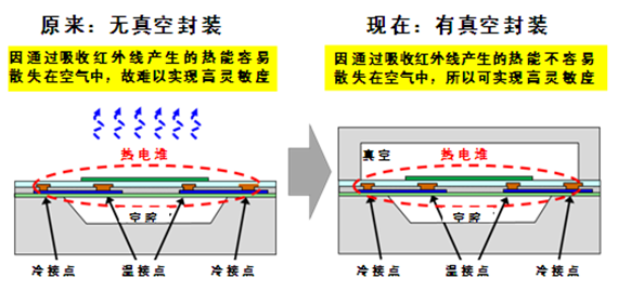 這次,世界首次成功將熱電堆真空封裝在芯片內(nèi)。采用真空封裝即可避免將熱電堆轉(zhuǎn)換的熱能散失在空氣中,使金屬接點(diǎn)之間的溫差變大,從而可實(shí)現(xiàn)更高的靈敏度。