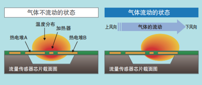 歐姆龍MEMS流量傳感器檢測原理:在沒有氣體流動的情況下以加熱器為中心,溫度分布左右對稱。流動的狀態下,加熱器上風向的溫度低,下風向溫度高,溫度分布不再對稱。將該溫差作為熱電堆的電動勢之差進行傳感,可測量流量、流速而不影響溫度、壓力。此外,熱電堆為熱電動勢方式,與電阻式相比,有助于降低功耗。