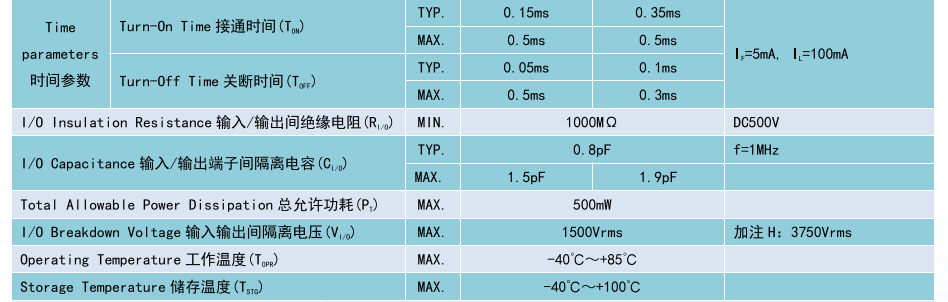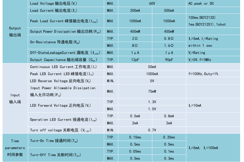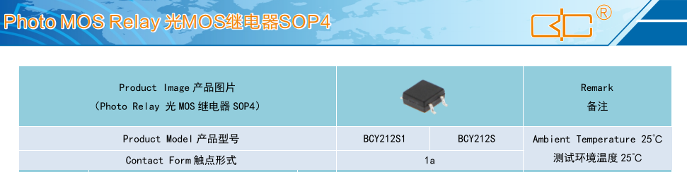 (Relay 光 MOS 繼電器 SOP4),Product Model產(chǎn)品型號(hào):BCY212S1、BCY212S,Contact Form觸點(diǎn)形式:1a,Ambient Temperature 25'C,測試環(huán)境溫度 25℃