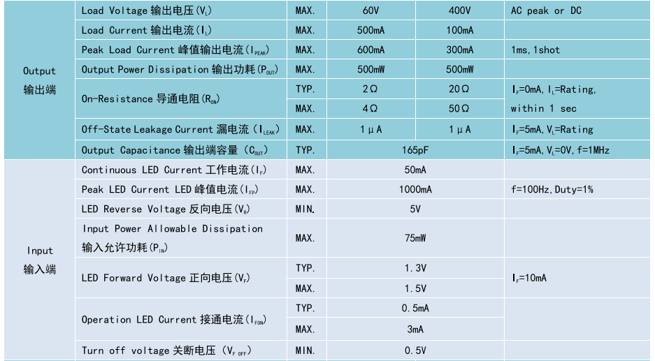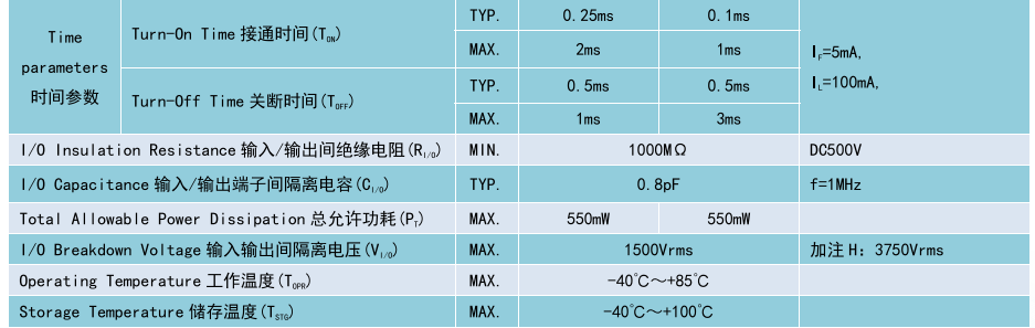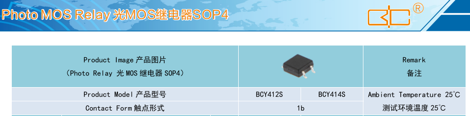 (Relay 光 MOS 繼電器 SOP4),Product Model產品型號:BCY412S、BCY414S,Contact Form 觸點形式:1b,Ambient Temperature 25°C,測試環(huán)境溫度 25℃
