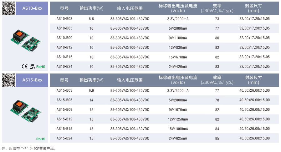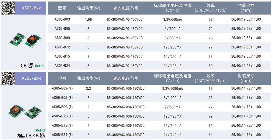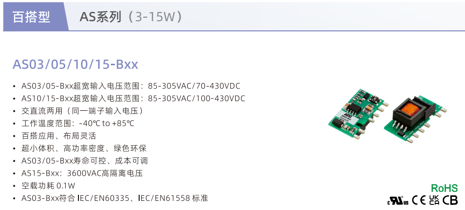 ?板載式電源AS03/05/10/15-BxX ??AS03/05-Bxx超寬輸入電壓范圍:85-305VAC/70-430VDC ??AS10/15-Bxx超寬輸入電壓范圍:85-305VAC/100-430VDC ??交直流兩用(同一端子輸入電壓) ??工作溫度范圍:-40°Cto +85°C ??百搭應用、布局靈活 ??超小體積、高功率密度、綠色環保 ??AS03/05-Bxx壽命可控、成本可調 ??AS15-Bxx:3600VAC高隔離電壓 ??空載功耗 0.1W ??AS03-Bxx符合IEC/
