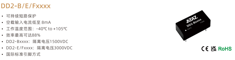 DN1-FxxxX ??可持續短路保護 ??空載輸入電流低至 8mA ??工作溫度范圍:-40°Cto +105°C ??效率高達 85% ??隔離電壓 3000VDC ??國際標準引腳方式