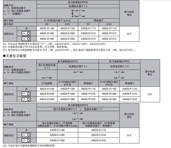 A8GS 遠(yuǎn)程復(fù)位 船形開關(guān) 帶復(fù)位功能船形開關(guān) 利用基于外部信號的 “復(fù)位功能”關(guān)閉電源開關(guān),設(shè)備的待機(jī)功率為零。 適用于浪涌較大的負(fù)載的電源ON/OFF。適用于TV-8(浪涌特性117A)。 備有適用于微小負(fù)載領(lǐng)域的接點(diǎn)構(gòu)造種類。 備有可同時ON/OFF微小負(fù)載領(lǐng)域、高負(fù)載領(lǐng)域的2極規(guī)格種類。 接點(diǎn)間隙大于3mm。 取得UL、cUL標(biāo)準(zhǔn)認(rèn)證,并符合EN標(biāo)準(zhǔn)。